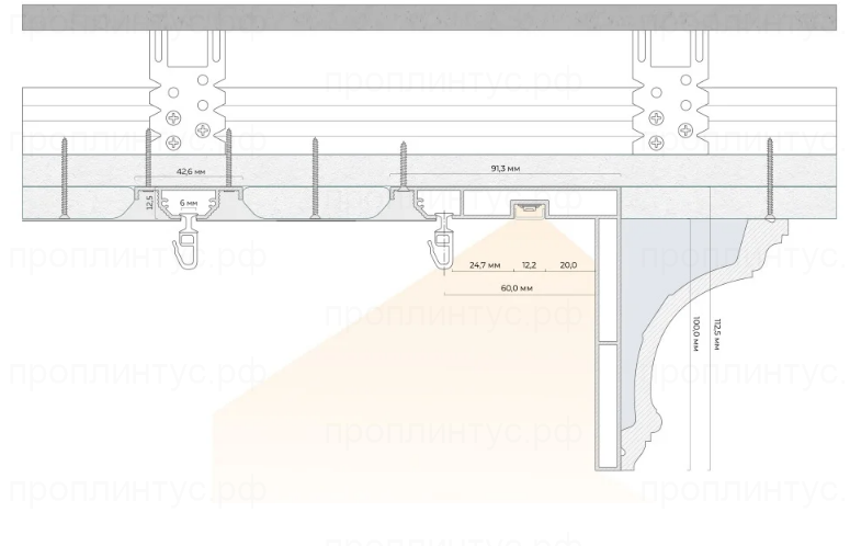 - Профиль крепится к основному потолку и вписан в каркас потолка из гипсокартона, что позволяет нивелировать усадку стен в новых домах, а значит гарантирует прочность и надёжность;