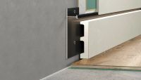Скрытый профиль маскирует стык между стеной и напольным покрытием, зрительно увеличивает помещение, избавляет пространство от лишнего визуального шума и подчеркивает монументальность.